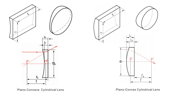 典型类型:平凸柱面透镜,平凹柱面透镜,双凸柱面透镜,双凹柱面透镜,弯月柱面透镜。